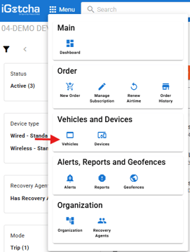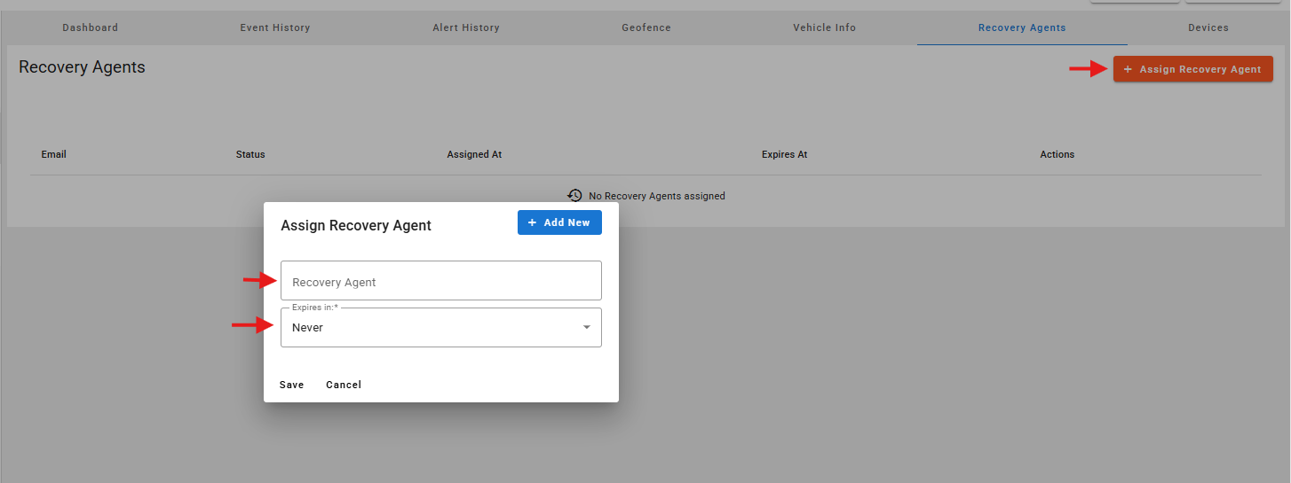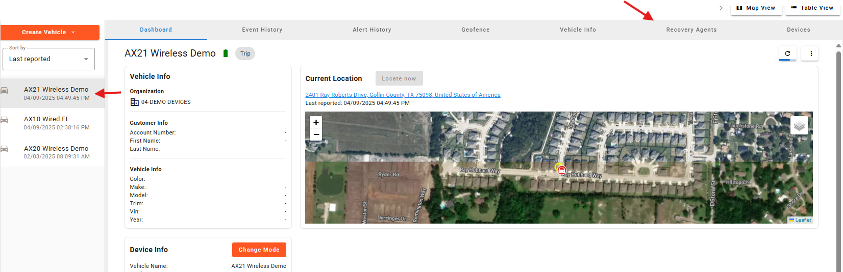 Select the vehicle out for repo in the device well on the left-hand side and select the "recovery agent" tab at the top.