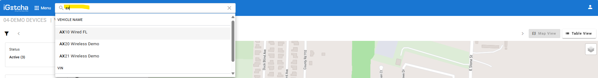When selecting Vehicles or Devices you can find the search bar at the top of the screen. By entering information (below) you can search for a device specifically on the account.